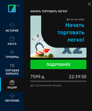 - Акции. Здесь представлены все проводимые брокером акции для существующих и новых клиентов. В подобных активностях в качестве награды участникам предполагается предоставление реальных денежных выплат за выполнение определенных действий. Один из наиболее часто встречаемых бонусов — выплата за первое пополнение депозита. Его размер составляет 100%, что позволяет приняв участие в акции, увеличить свои финансовые возможности в два раза.