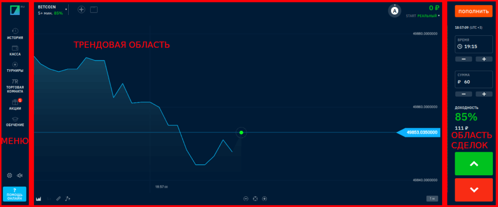 После успешной авторизации клиент попадает в меню терминала. По умолчанию отображается Биткоин — самая известная и волатильная на сегодняшний день криптовалюта. Для настройки режима отображения трейдеру необходимо обратиться к соответствующим опциям, рассмотренным далее. Условно открывшееся окно можно разделить на три части — раздел меню, область тренда и раздел проведения операций. Далее поговорим о каждом из них по отдельности.
