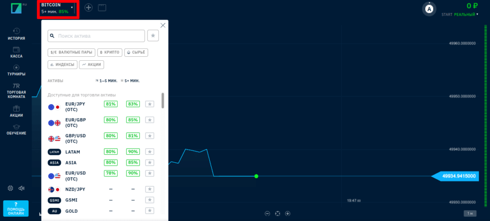 - выбирать любой из доступных для торговли активов. На текущий момент предлагается трейдинг опционами на криптовалюты, сырьевые контракты, американские индексы и акции, а также валютные пары Форекс. Выбор подходящего инструмента осуществляется в верхней части окна.