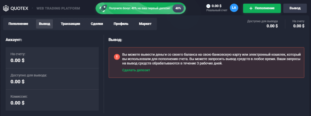 Без верификации для вывода средств с Квотекс счета доступны криптовалютные кошельки и аккаунты электронных денег. После добавления, проверки и верификации банковской карты появляется еще один канал пополнения депозита и списания. Для ряда самых популярных криптовалют, среди которых BTC, LTC, ETH, дополнительно предлагается бонус в виде 5% от объема пополнения.
