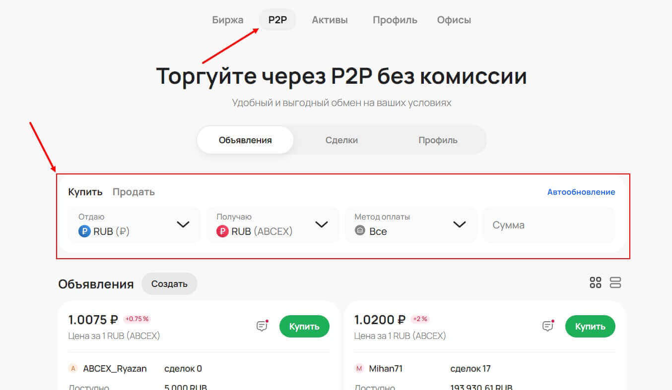 После пополнения баланса, перейдите в раздел P2P торговли, где представлены активные объявления от других пользователей. Выберите “купить”, если планируете пополнить баланс цифровыми активами или “продать” для продажи. Вы можете отфильтровать их по нужной вам валюте, способу оплаты (сбербанк, тинькофф и т.д.) и сумме.