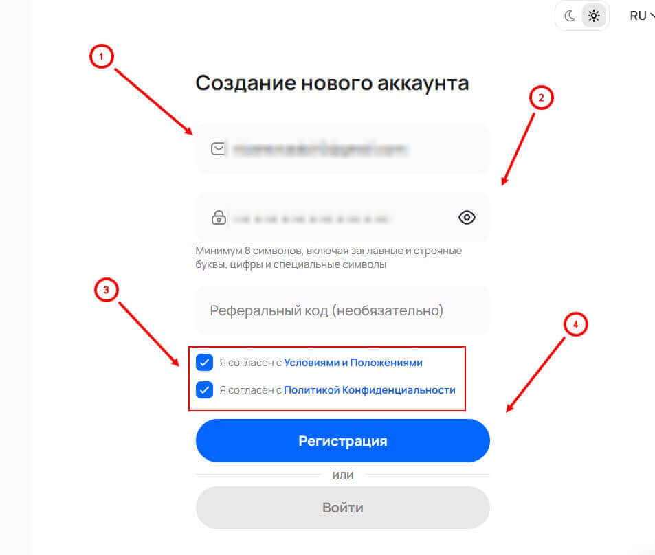 Для использования функции P2P на бирже ABCEX начните с регистрации, указав адрес электронной почты и пароль. Согласитесь с условиями и положениями и нажмите на кнопку “регистрация”. Затем подтвердите почту, перейдя по ссылке, которая будет указана в письме (нажав на кнопку “активировать аккаунт”).