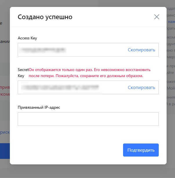 Появятся приватный (Access Key) и секретный ключ (Secret Key). Ни в коем случае не давайте их третьим лицам, чтобы избежать проблем. Первый будет отображаться на аккаунте, а второй ключ необходимо сохранить – его невозможно восстановить в будущем. Как только записали, нажмите на «Подтвердить».