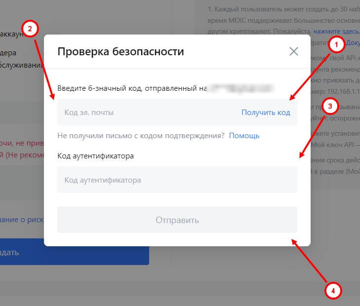 - Подтвердить создание кодом. Для этого нажмите на «получить код» (для подтверждения по смс и эл. почте) и кликните на «отправить». Важно отметить, что создание API Keys доступно, если привязать не менее двух способов подтверждения.