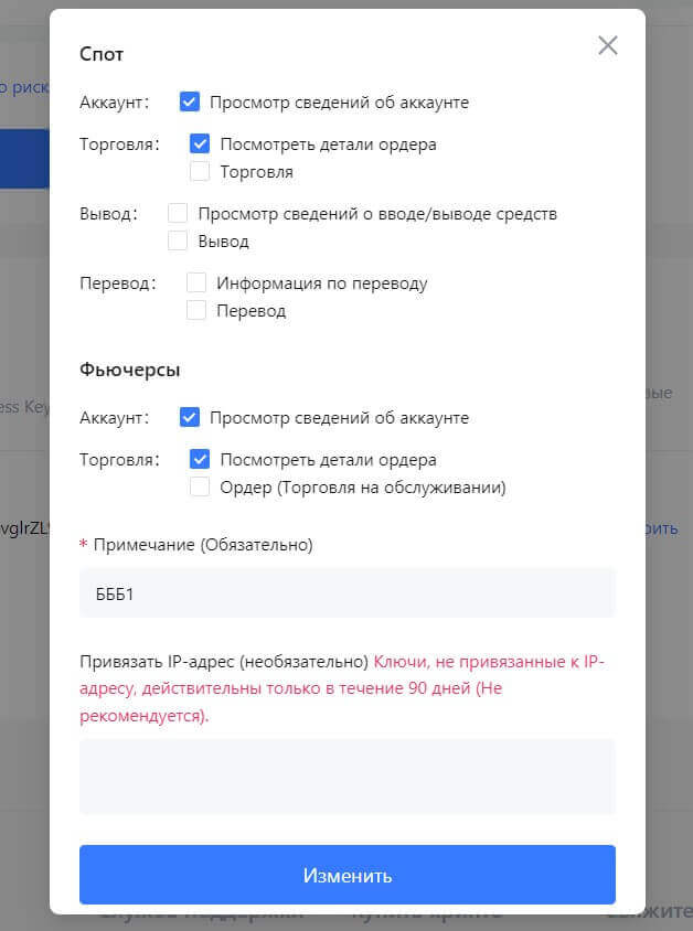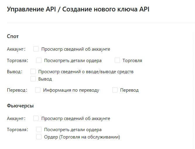 - В новой странице в форме создания API необходимо настроить доступ для ключа, выбрав необходимые пункты в разделах «Спот» и «Фьючерсы».