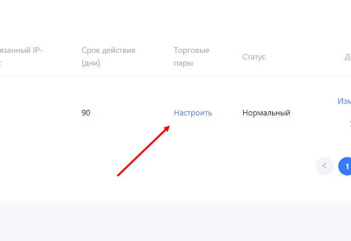 После того, как пользователь создал ключ можно настроить торговые пары или изменить доступные рынки для отдельного API. Чтобы настроить торговые пары, рядом со вкладкой «торговые пары» нажмите на кнопку «Настроить».