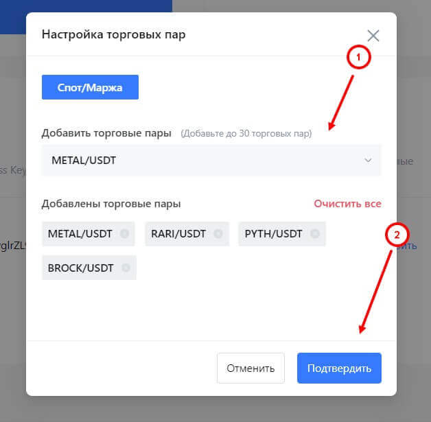 Откроется окно, где нужно в пункте «добавить торговые пары», отметить те, которые необходимы. В блоке «Добавленные торговые пары» будут отображаться выбранные пользователем. Чтобы сохранить, кликните на кнопку «Подтвердить».