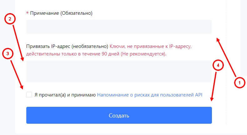 - Указать примечание и привязать IP-адреса (опционально), после чего поставить галочку в пункте, связанный с соглашением о рисках при использовании API и нажать на кнопку «Создать».