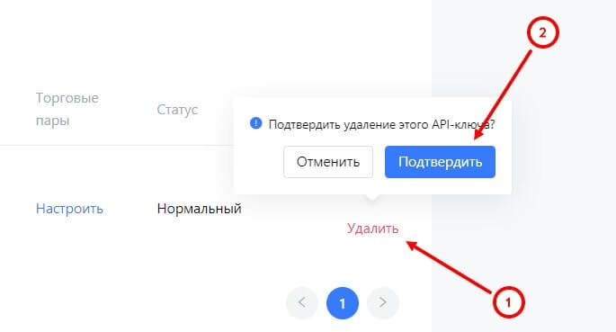 Для удаления API ключа нужно рядом с API Keys нажать на кнопку «удалить» и нажать на кнопку «Подтвердить» во всплывающем окне.