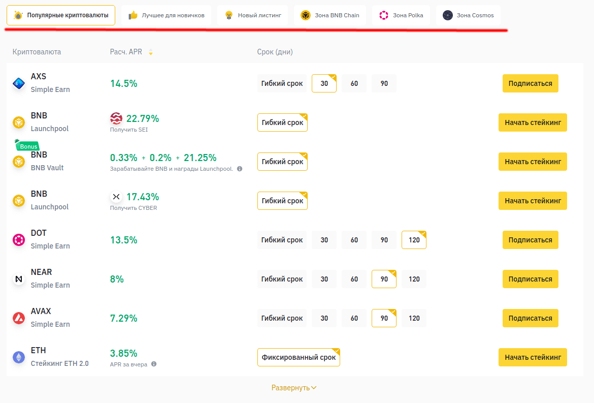 При первом открытии инвестиционного раздела портала криптобиржи Binance, посетители попадают на страницу с наиболее интересными предложениями, где можно в несколько кликов стать участником определенной программы пассивных вложений. Ниже представлен актуальный на момент публикации материала (конец августа 2023 года) срез имеющихся предложений.