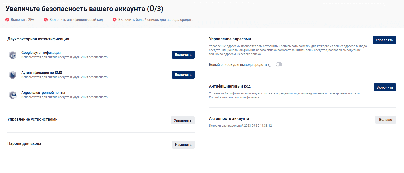 - Подключение двухфакторной аутентификации. Дополнительная проверка входа с использованием аутентификацией через программу от Google, либо смс сообщение позволяет исключить получение доступа к имеющимся финансам посторонними при компрометации логина и пароля для входа.
