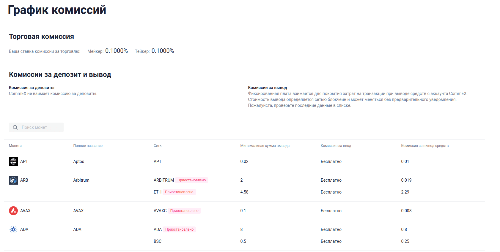 В интерфейсе кошелька можно найти разделы как пополнить или провести списание имеющихся активов. При пополнении не взимаются дополнительные комиссии, кроме предусмотренных блокчейном, либо сторонней платежной системой. При снятии «крипты» будет дополнительно начислена комиссия, согласно таблицы ниже, в зависимости от используемого в процессе вывода токена. Подробнее обо всех видах и объемах применяемых комиссионных сборов можно узнать из соответствующего справочного раздела сайта. На первых порах доступен только вывод с использованием сторонних криптокошельков.