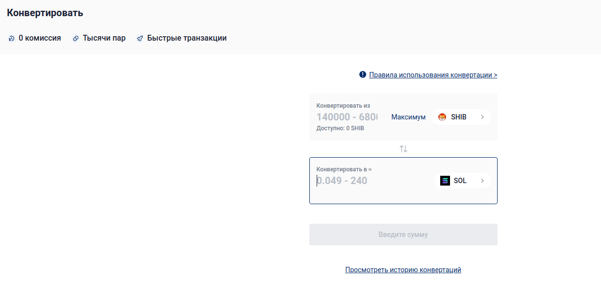 - Конвертации криптомонет между собой. Пригодится, если на счету после ухода с Binance остались токены, использование которых невозможно при проведении транзакций на новой площадке. Основные преимущества при совершении подобных операций — полное отсутствие комиссий, а также более тысячи доступных криптотокенов, что позволяет в полной мере использовать имеющиеся цифровые активы, даже если они не поддерживаются биржей.