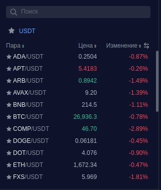 - Спотового криптовалютного рынка. Здесь расположены самые востребованные в ежедневной торговле криптопары. В торговом терминале предлагается 25 пар с наивысшей ликвидностью. Найти непопулярные монеты не представлялось возможным. Этот фактор относится к небольшому сроку существования компании на рынке.