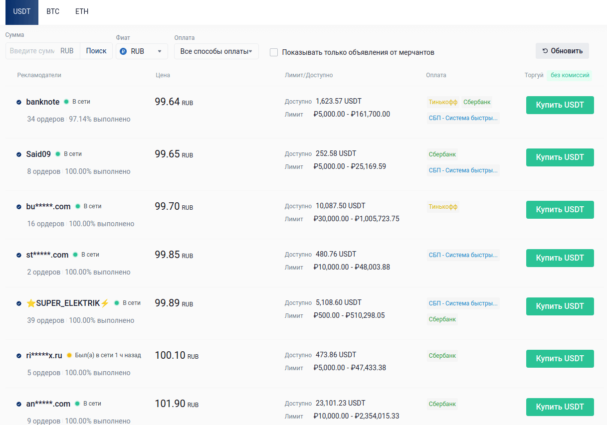 - Прямых сделок через P2P. Ниже отображена выдача существовавших объявлений о продаже токенов USDT. Из предложенного списка даже неподготовленный покупатель может выбрать наиболее приглянувшееся предложение по многим параметрам — цене 1 монеты, способам оплаты, доступному к приобретению количеству.