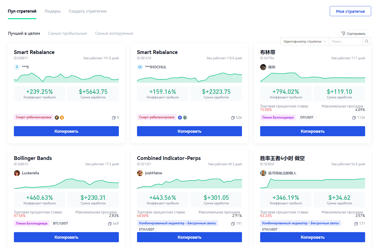 - Копирование сделок опытных трейдеров. По всем предлагаемым для копирования стратегиям предоставляется подробная статистика, потому выбрать для себя любой желаемый способ получения профита сможет как активный внутридневной трейдер, у которого не хватает возможностей для самостоятельного управления имеющимися активами, так и инвестор, не желающий тратить время на изучение рынка и работу в нем. Допускается добавлять свои собственные стратегии, к следованию которыми смогут присоединиться желающие.