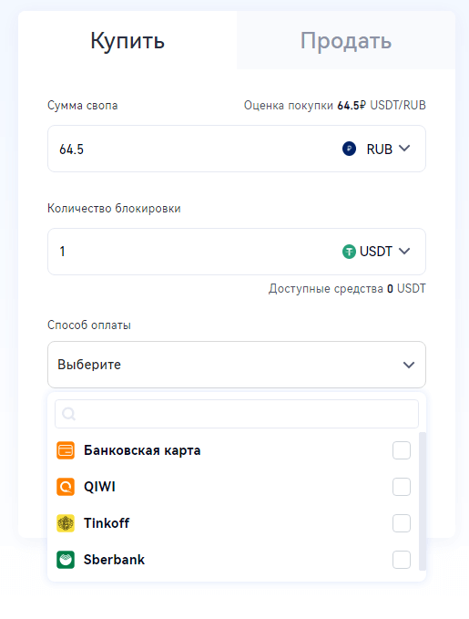 Одно из главных преимуществ P2P торговли через Gate.io – проведение транзакций без взимания дополнительных сборов (на момент публикации материала). Достаточно ввести желаемое количество токенов выбранного типа и выбрать способ оплаты транзакции – российским трейдерам предлагаются варианты с помощью банковских карт, электронной платежной системы Qiwi, либо специализированных банк-клиентов от Сбербанка и Тинькофф-банка, которые работают и для Беларусских трейдеров.