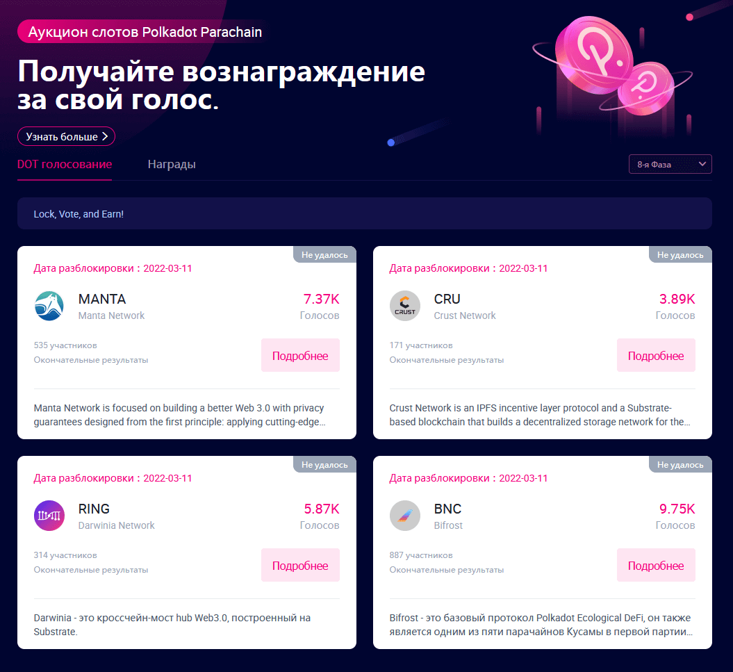 - Вознаграждения за участие в аукционах слотов для Polkadot. Даже если проект, за который был отдан голос, не выигрывает тендер, инвестированные токены будут возвращены владельцу.