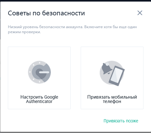 Из предлагаемых на этом этапе способов защиты – подключение Google Authenticator для генерации случайного кода безопасности при каждом входе в аккаунт, а также привязка номера мобильного телефона для отправки проверочных кодов. Рекомендуется провести настройку обоих параметров.