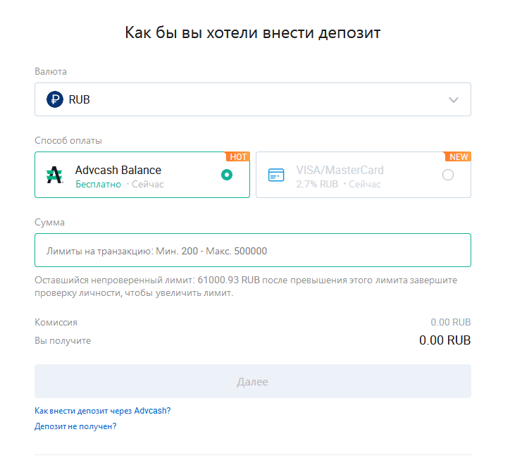 - Через предлагаемые способы оплаты. Добавить на свой счет криптовалюту по текущему курсу можно с помощью транзакции через систему электронных платежей Advcash. Пополнение с банковской карты на момент публикации материала оказалось недоступно из-за санкционных ограничений. Однако лимит ввода средств от Advcash на 500 000 рублей поможет оперативно решать вопросы зачисления средств, причем за подобные транзакции не предусмотрено комиссионных сборов.