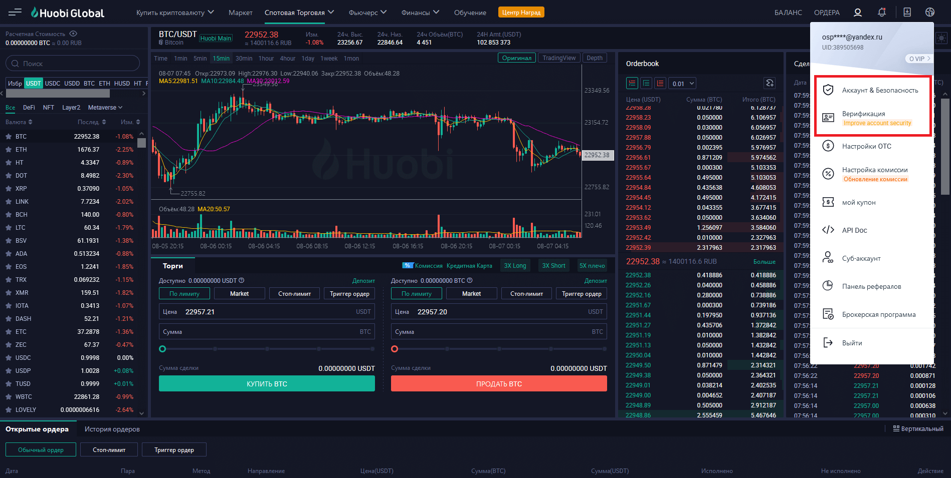 Из дополнительных настроек безопасности Хуоби предлагает следующие опции: