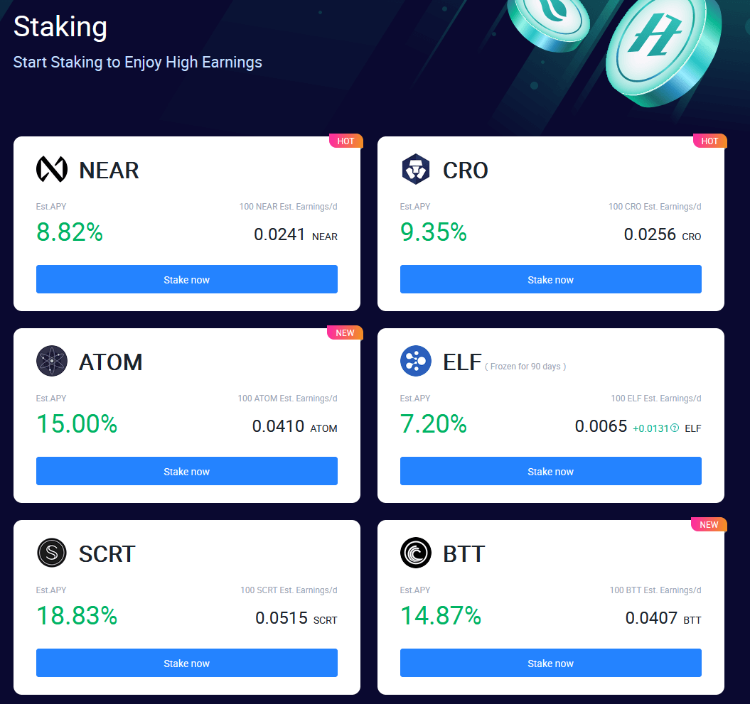 - Стейкинг монет. В зависимости от выбранного токена прибыль от инвестируемой суммы может составлять 20% годовых и даже более для некоторых токенов. Важно не забывать о существующих рисках потери вложений от падения рыночной стоимости выбранных монет. Добиться постоянной доходности в этой области трейдинга можно только ежедневно мониторя состояние и рейтинг актива, в который совершено вложение. Лучше вовремя выйти из стейкинга, потеряв потенциальный профит, даже выраженный в двухзначных цифрах, чем лишиться еще большей суммы от снижения курса.