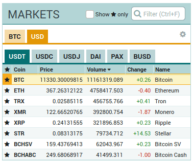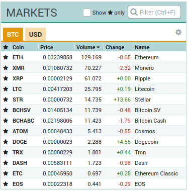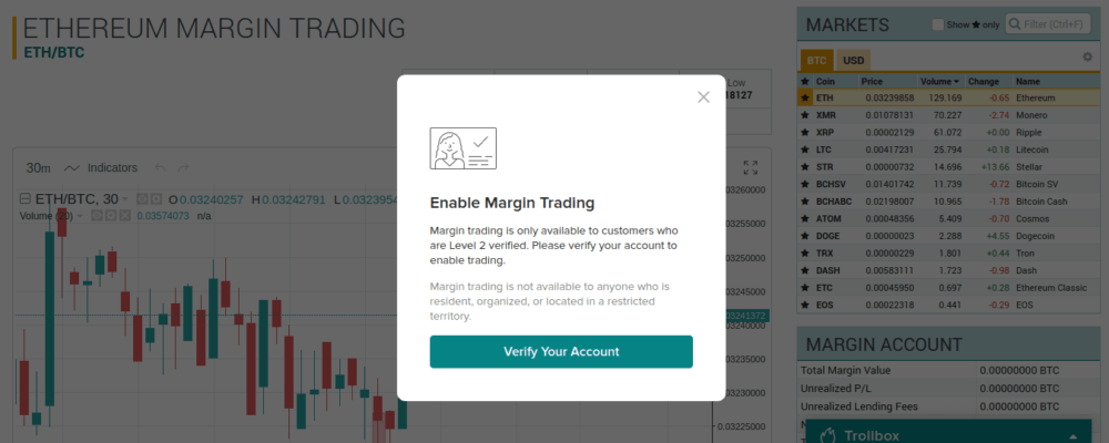 Перед началом совершения операций необходимо верифицироваться (об ее отсутствии предупреждает всплывающее окно, как на скриншоте выше). Для трейдинга предоставлено 13 наиболее популярных валютных пар по отношению к Биткоину.
