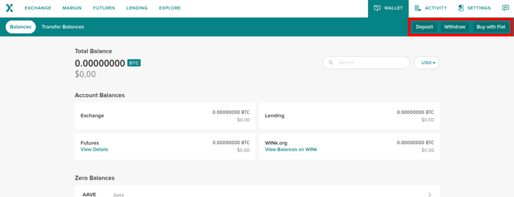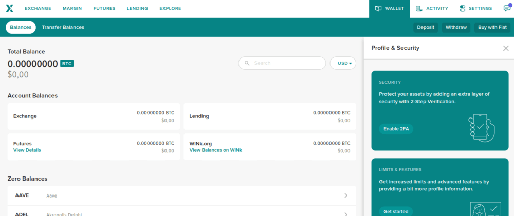 В кабинете отображается информация о текущем балансе кошелька, история активности, а также открыта процедура проверки аккаунта. Эта процедура не является обязательной, но накладывает некоторые ограничения на управление движением средств со своего счета в случае отказа от ее прохождения. Например, первый шаг ограничивает вывод в $10 000 в день, а перед тем, как вывести бОльшую сумму, необходимо пройти второй этап. Это позволит использовать фьючерсные контракты, а также получать увеличенное маржинальное плечо для трейдинга (для верификации 1-го уровня маржу больше 1:10 получить невозможно).
