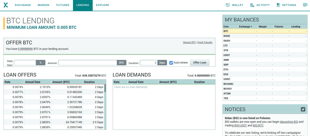 Из представленного ниже скриншота можно увидеть, что 2-дневные кредиты в биткоинах выдавались по ставке от 2,8%. Такая ставка позволяет пассивным инвесторам в значительной степени увеличивать свои депозиты, что хоть и не сопоставимо с доходом от активного трейдинга, но все же представляет весьма интересный уровень дохода.