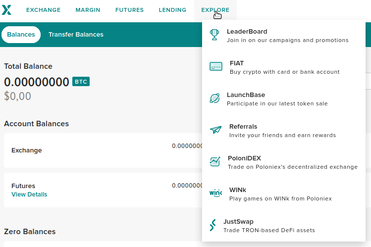В дополнение к основным функциям торговли и управления счетом, Poloniex предлагает клиентам и другие полезные дополнительные возможности. Обзор данных функций доступен из вкладки «Explore» главного окна личного кабинета.