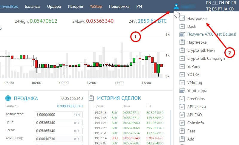 Прежде чем начать пользоваться услугами криптобиржи YoBit, важно также выполнить настройку аккаунта. Сделать это можно, открыв всплывающее меню и нажать на кнопку “Настройки”.