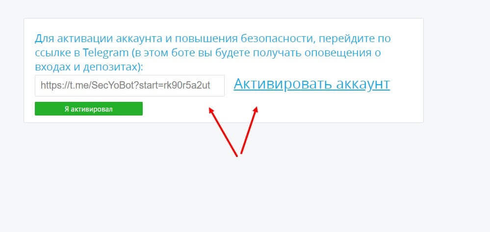После регистрации сервис попросит прикрепить аккаунта в Telegram, тем самым повысив безопасность учетной записи. Без этого клиент не сможет работать на бирже YoBit. Чтобы активировать аккаунт, скопируйте адрес, указанный в специальной строке или же нажмите на кнопку “Активировать аккаунт”. Откроется SecYoBot в мессенджере, где нужно прописать команду “/start”.