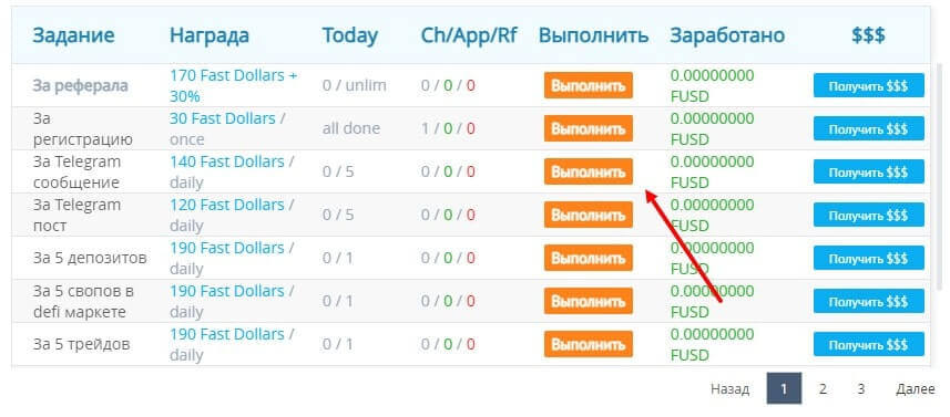 Затем откроется список доступных заданий. Чтобы выполнить и получить, нажмите на кнопку “Выполнить”.
