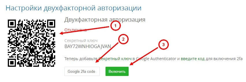После этого нужно отсканировать QR-код в приложении Google Authenticator и ввести код, который будет изображен в нем и вписать в поле Google 2fa code. Затем нажмите на кнопку “Включить”.
