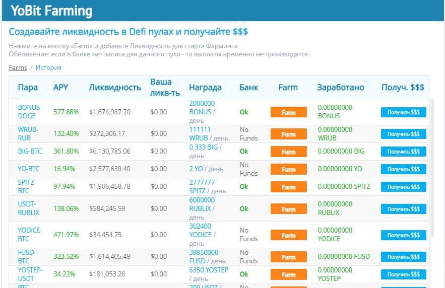 Сервис, позволяющий создавать пул ликвидности на бирже в DeFi, получая тем самым вознаграждение в APY (% годовых). Чтобы участвовать, необходимо нажать на кнопку “Farm” и откроется страница, где можно будет отправить монеты на ликвидность. Для отправки во вкладке “Добавить ликвидность” нужно указать количество монет. Чтобы вернуть средства из ликвидности, нужно воспользоваться вкладкой “Забрать ликвидность”.