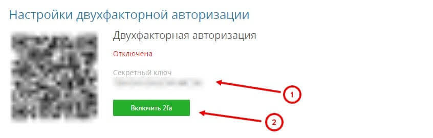 В разделе нужно настроить одну из основных типов защиты аккаунта – двухфакторную аутентификацию (2FA). Чтобы настроить – нажмите на кнопку “Включить 2fa” и записать секретный ключ, который понадобится при отключении аккаунта от данной функции.