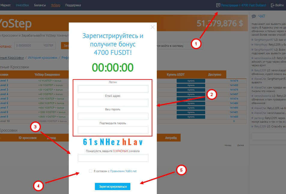 На главной странице нужно кликнуть на пункт “Регистрация + 4700 Fast Dollars”, расположенной в верхней части страницы. Затем заполните форму, где нужно ввести логин, адрес электронной почты, пароль (с его подтверждением) и пройти капчу проверку, введя нужные символы. Затем перепроверьте введенную информацию, согласитесь с правилами сервиса си нажмите на кнопку “Зарегистрироваться”.