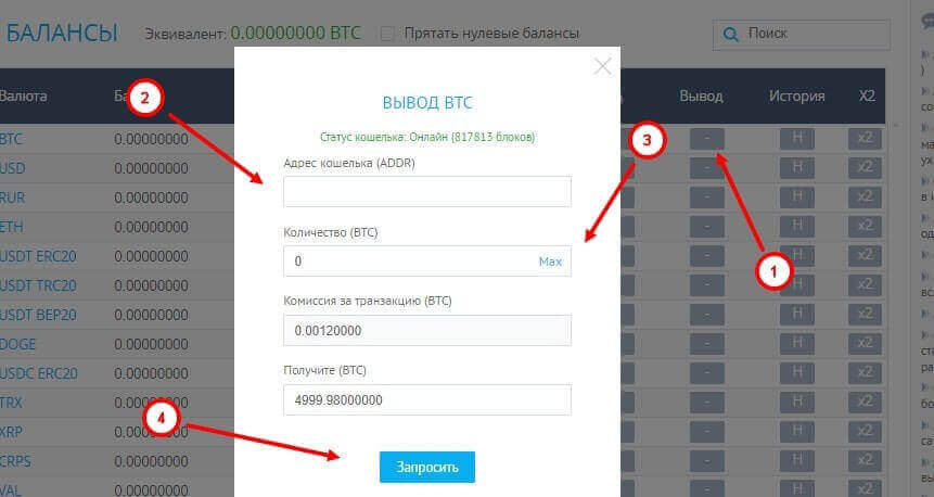 Перейдя в раздел для снятия средств со счета нужно выбрать актив, который планируете выводить и нажимаете на иконку “-”. При выводе криптовалют нужно будет ввести собственный адрес криптокошелька, сумму вывода. В поле “Получите” будет указано то, какую сумму вы получите после вывода за вычетом комиссии за транзакцию. Перепроверьте введенную информацию и нажмите на кнопку “Запросить”.