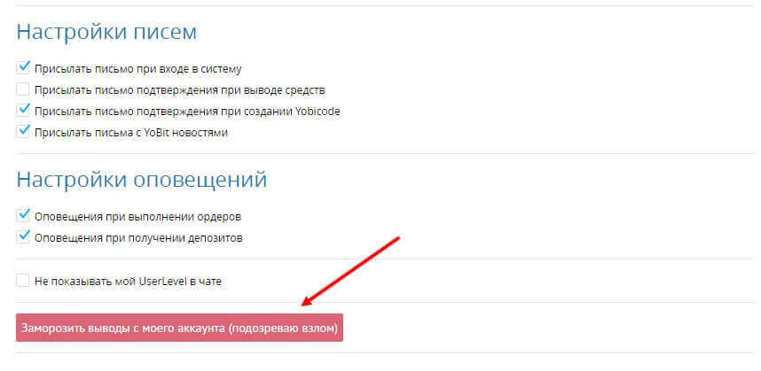 После этого ваш аккаунт будет полностью защищен от взлома. Также в разделе можно настроить письма и оповещения. Также, в случае кражи данных аккаунта можно войти в аккаунт и нажать на кнопку “Заморозить выводы с моего аккаунта (подозреваю взлом)”.
