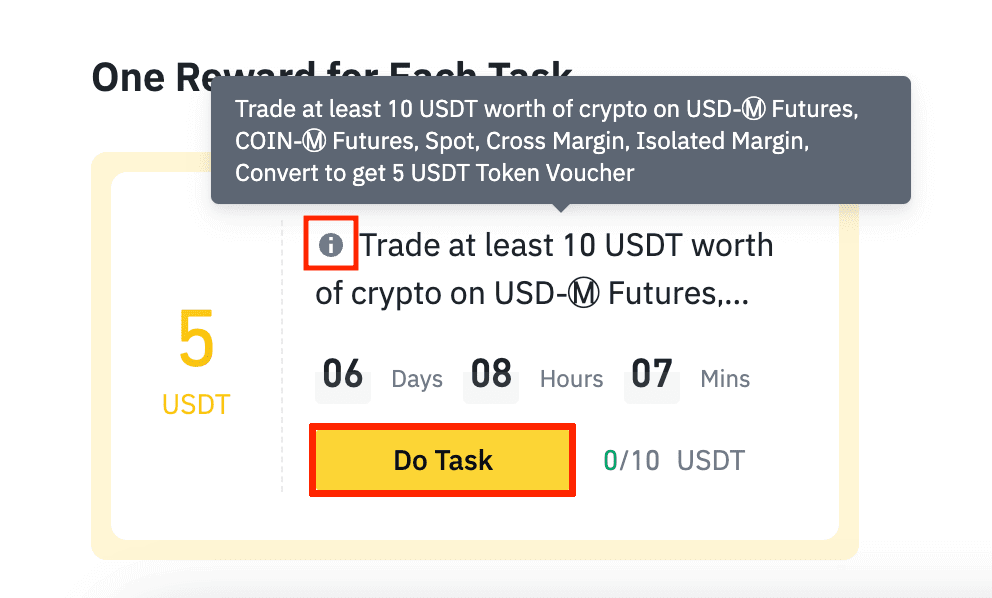 При наведении курсора на значок «i» появляется вся необходимая информация о предлагаемом задании. Нажатие на кнопку «Do Task» (или «выполнить/начать задание» в русскоязычном интерфейсе) начинает отсчет предполагаемого дедлайна для завершения. Если все условия выполнены в обозначенные сроки, активируется кнопка «Получить бонус».