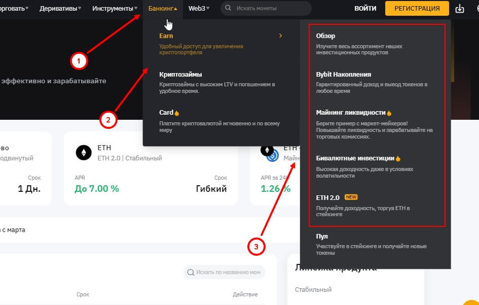 Каждый продукт позволяет пользователям зарабатывать средства в виде ARP – процент от вложенной суммы. К ним относятся ByBit накопления, майнинг ликвидности, бивалютные инвестиции и стейкинг ETH 2.0. Прежде чем воспользоваться сервисом, необходимо зарегистрироваться или войти в аккаунт, используя регистрационные данные (номер телефона или адрес электронной почты и пароль).