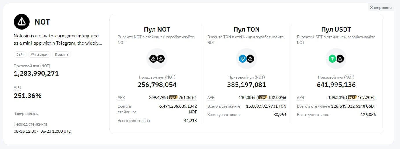 Также не стоит забывать и про недавно завершившийся новый лаунчпул с отгремевшей монетой NotCoin. Общий призовой фонд в 1,2 миллиарда монет разделило множество участников. Доход составил до 132% при вложении криптомонеты TON, до 167,2% в USDT и до 251,36% при вложении самого NotCoin. Период стейкинга был с 16 по 23 мая до 12 часов по UTC.