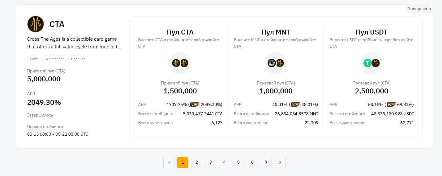 Просматривая прошлые лаунчпулы, можно увидеть то, что ARP составляет до нескольких тысяч процентов, в зависимости от выбранной криптовалюты. Одним из таких успешных считается криптовалюта CTA. Вложившие данную монету смогли получить ARP в размере 1707,75% (обычные пользователи) и 2049,3% (VIP) пользователи. Те, кто вложили крипту Manta (MNT) или Tether USD (USDT) получили доходность в 40,01 (48,01) и 58,18 (69,81%) соответственно. Стейкинг проходил в период с 15 по 22 мая до 8 часов по UTC.