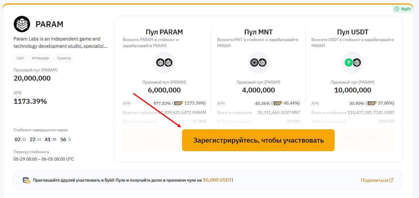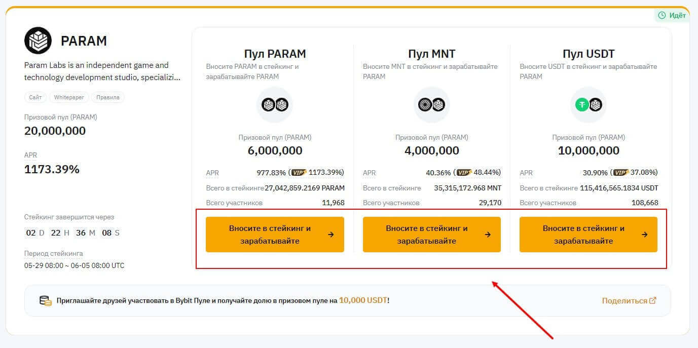 Затем необходимо залочить определенное количество криптовалюты, указанной в условиях пула. Их может быть несколько, например, на июнь 2024 года можно принять участие в лаунчпаде PARAM, внеся в стейкинг монеты PARAM, MNT (Mantle) или USDT (Tether USD). Залоченные средства будут использованы в качестве вклада для получения вознаграждений. Выберите монету, нажав на кнопку “вносите в стейкинг и зарабатывайте” под необходимой криптовалютой.