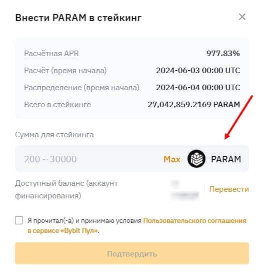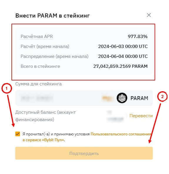 Перед подтверждением можно увидеть расчетный ARP отправленных монет в стейкинге, дата начала и распределение, а также общую сумму в стейкинге. Если согласны с условием, то проставьте галочку в пункте, где указано, что вы прочитали и согласились с условиями пользовательского соглашения и нажмите на кнопку “подтвердить”.