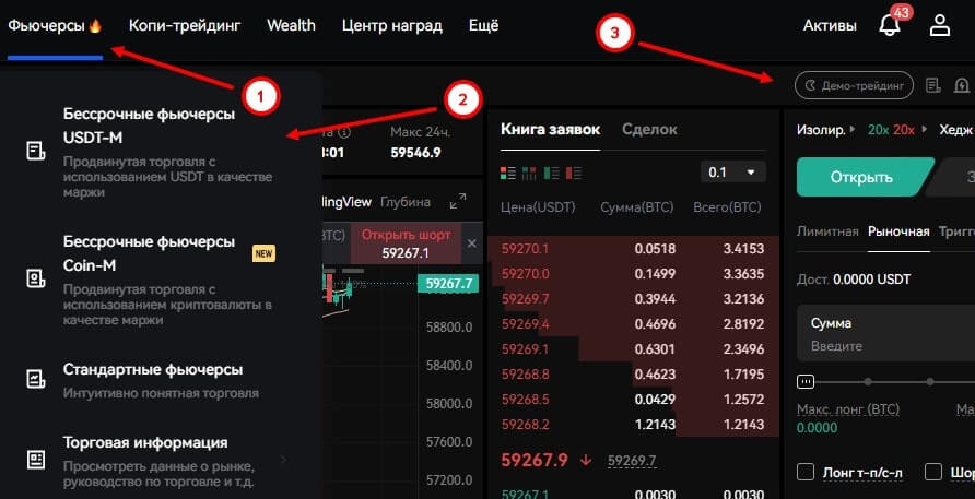- После активации аккаунта и входа в систему выберите раздел «Фьючерсы» – «Бессрочные фьючерсы» и активируйте опцию «Демо счет» в пользовательском интерфейсе. BingX предоставляет виртуальные средства, которые можно использовать для имитации покупки и продажи криптовалют. Это отличная возможность освоить различные инструменты и функции платформы без финансовых потерь.