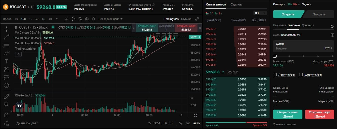 В качестве виртуальной валюты (аналог USDT) используется монета VST, которая позволяет торговать на демо-счете. На начальном этапе дается 100 000 VST. Если демо счет на BingX обнулится, то можно запросить ещё монеток. Отметим то, что выводить их нельзя.