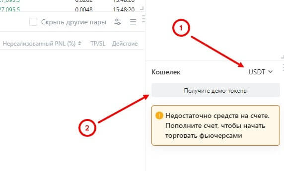 Чтобы начать торговлю, в нижней части страницы в разделе “кошелёк” выберите криптовалюту и нажмите на кнопку “получите демо-токены”.