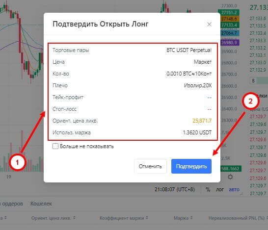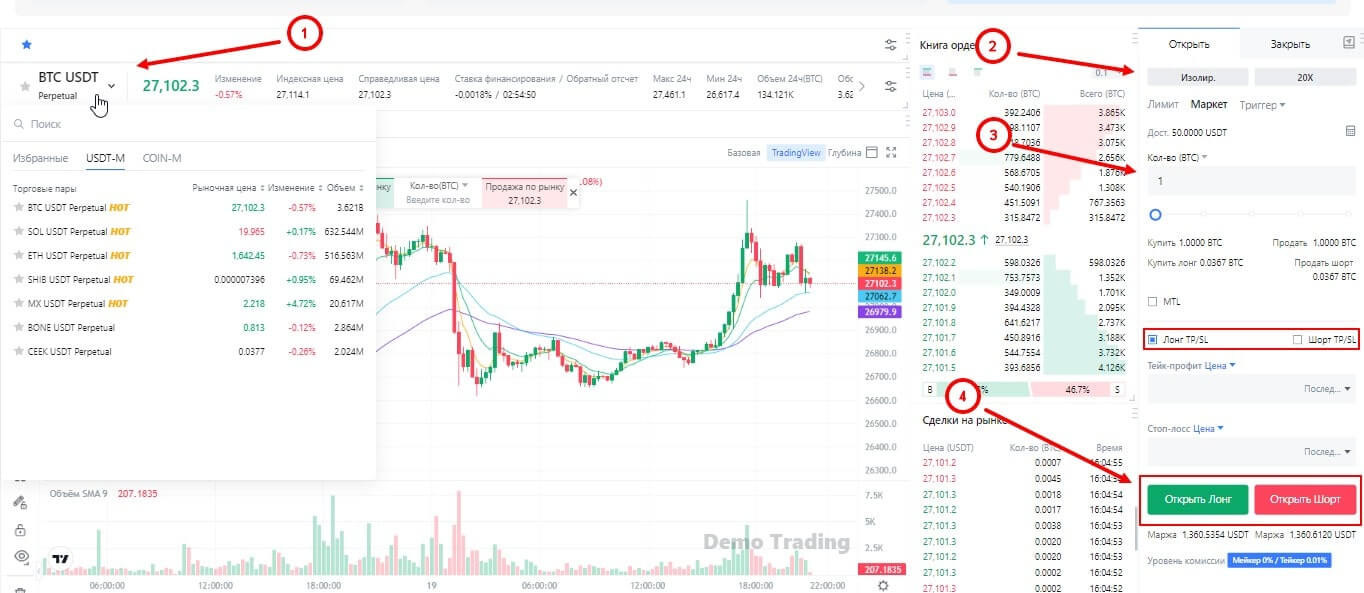 Торговля происходит точно также, как и при проведении операций на реальном счете: выберите фьючерсную пару, укажите вид маржи (если необходима), сумма покупаемого производного контакта по базовой криптовалюте на тестовом счете и тип позиций (лонг или шорт). Также можно установить тейк-профит или стоп-лосс, активировав функцию “Лонг TP/SL” или “Шорт TP/SL”.