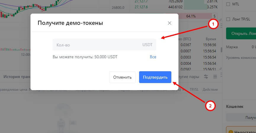 Откроется поле, где нужно ввести сумму токенов, вплоть до 50 000 USDT. После того как пользователь указал сумму необходимо нажать на кнопку “Подтвердить” и средства будут зачислены на тестовый счет.